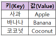 # {'사과': 'Apple', '바나나': 'Banana', '코코넛': 'Coconut'}