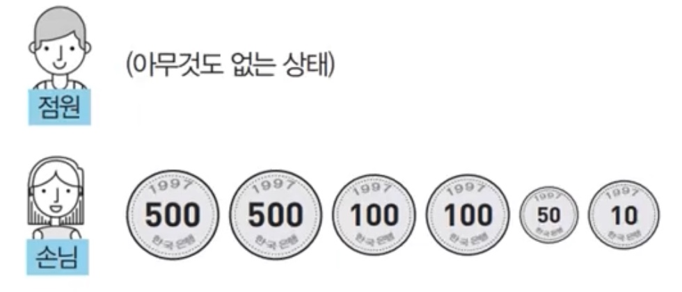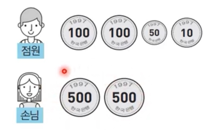 ※ 본래 점원이 거슬러 줘야 할 돈은 보이지 않고 잔돈 무더기가 보여야 논리적으로 맞다. 이해를 돕고자 미리 거스름돈을 시각적으로 표현한 것이다.