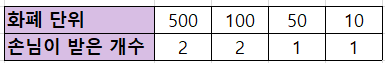 - 이후에 100원, 50원, 10원짜리 동전을 차례대로 거슬러 줄 수 있을 만큼 거슬러 주면 된다.