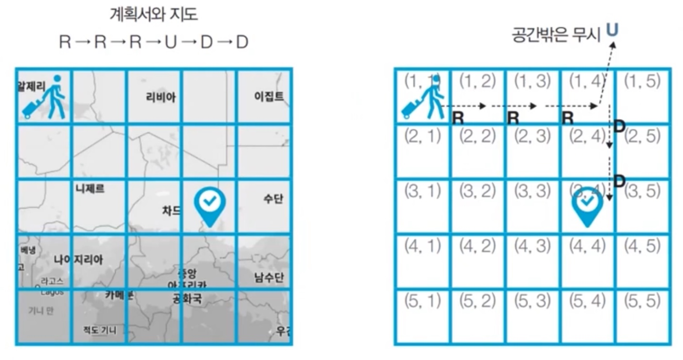 - 이때 여행가 A가 N X N 크기의 정사각형 공간을 벗어나는 움직임은 무시됩니다. 예를 들어 (1, 1)의 위치에서 L 혹은 U를 만나면 무시됩니다. 다음은 N = 5인 지도와 계획서입니다.