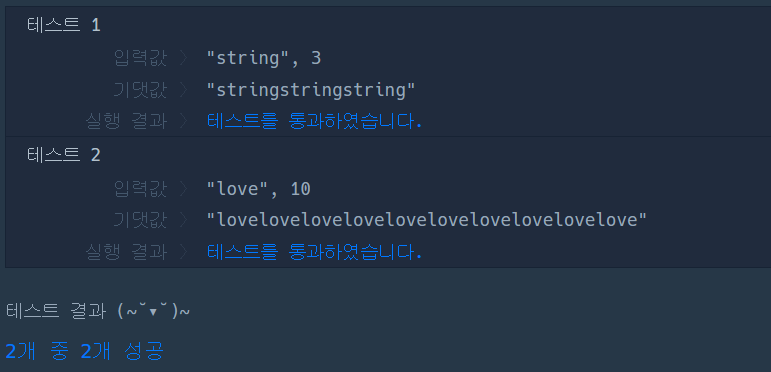 예제 2번의 my_string은 "love"이고 이를 10번 반복한 문자열은 "lovelovelovelovelovelovelovelovelovelove"이므로 이를 return 합니다.