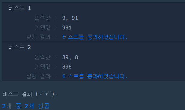 a + b = 898 이고, b + a = 889 입니다. 둘 중 더 큰 값은 898 이므로 898을 return 합니다.
