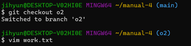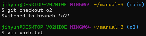 8. o2 브랜치의 work.txt 파일도 수정한다. 먼저 o2 브랜치로 체크아웃하고 work.txt 파일을 연다.