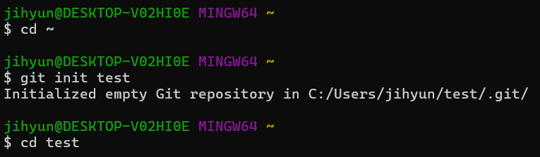 1. 홈 디렉터리로 이동한 후 test라는 깃 저장소를 만들고, test 디렉터리로 이동한다.