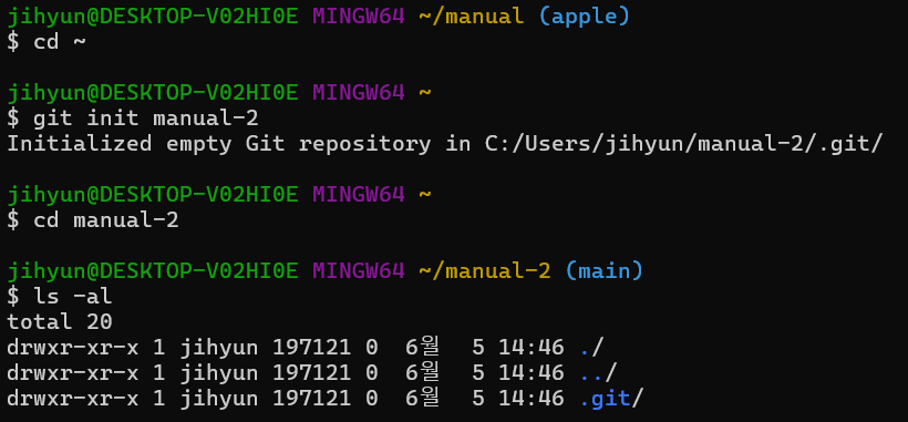 1. 홈 디렉터리에서 manual-2라는 깃 저장소를 만든다. git init 다음에 디렉터리 이름을 입력하면 새로운 디렉터리를 만들고 저장소를 초기화하는 과정을 한꺼번에 처리할 수 있다. manual-2 디렉터리로 이동한 후 ls -al 명령을 사용하면 .git/ 디렉터리가 만들어진 것을 확인할 수 있다.