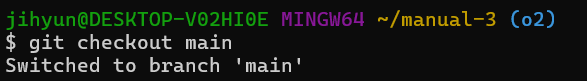 11. master 브랜치와 o2 브랜치 양쪽에서 work.txt 파일을 수정했지만 문서 안의 수정 위치는 다르다. o2 브랜치를 master 브랜치에 합치기 위해 master 브랜치로 체크아웃한다. (나는 master가 아닌 main)