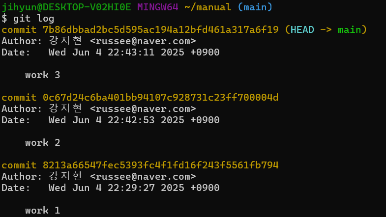 9. 커밋이 끝나면 'git log'를 입력해서 커밋 내역을 확인한다. 커밋 메시지가 'work 1', 'work 2', 'work 3'인 커밋들이 보일 것이다. master 브랜치가 가장 최신 커밋인 'work 3'을 가리키고 있고, HEAD가 master 브랜치를 가리키고 있다. HEAD는 여러 브랜치 중에서 현재 작업 중인 브랜치를 가리킨다.