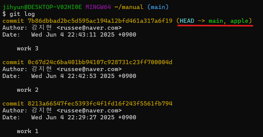 5. (HEAD -> apple)이라고 되어 있으니 현재 apple 브랜치에 체크아웃한 상태이고, apple 브랜치의 최신 커밋은 'apple content 4'이다.