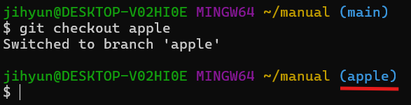 6. $ 위에 나타난 파일 경로 끝에 (apple)이라고 표시된다. 현재 브랜치가 apple이라는 뜻이다.