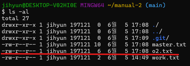 2. manual 디렉터리를 저장소로 만들고 ls -al 명령을 사용하여 .git 디렉터리 만들어졌는지 확인한다.