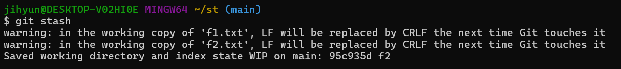 6. f1.txt 파일과 f2.txt 파일을 커밋하기 전에 다른 파일을 수정해야 한다고 가정해보자. 커밋하지 않은 수정 내용을 어딘가에 보관하려면 git stash 명령을 사용한다. git stash save 또는 간단히 git stash라고만 해도 된다.