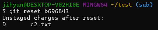 11. sub 브랜치의 최신 커밋이 master 브랜치의 최신 커밋인 c2로 바뀐다. HEAD는 그대로 sub 브랜치를 가리키고 있다. 이렇게 git reset 명령을 사용하면 현재 브랜치가 가리키는 커밋을 여러 브랜치 사이를 넘나들면서 제어할 수 있다. sub 브랜치는 c2 커밋을 가리키고 있기 때문에 원래 가리키고 있던 s1 커밋은 연결이 끊기면서 삭제된다.