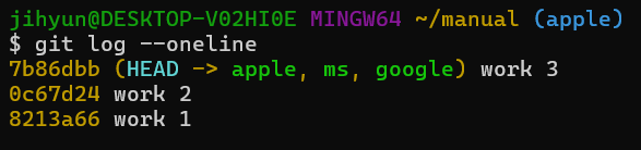 1. git log로 확인하면 master 브랜치를 비롯하여 ms, google, apple 브랜치가 'work 3' 커밋 상태에서 만들어진 것을 확인할 수 있다. master 브랜치 뿐만 아니라 ms와 google, apple 브랜치에도 최신 커밋이 'work 3'라는 뜻이다.