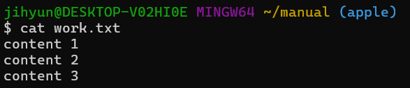 9. work.txt 파일에 무엇이 있는지 cat 명령을 통해 확인한다. 최신 커밋이 work3 이기 때문에 content 1 부터 content 3까지 세 개의 행만 존재한다. apple 브랜치가 master 브랜치에서 분기된 이후에 master 브랜치에 추가된 커밋은 apple 브랜치에 영향을 미치지 않았단 것을 알 수 있다.