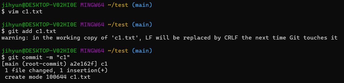 2. 빔에서 c1.txt 파일을 만들고 숫자 '1'을 입력하고 저장한다. c1.txt를 스테이지에 올리고 커밋한다. 커밋 메시지는 'c1'이라고 한다.