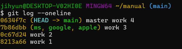3. matser 브랜치에 새로운 커밋이 추가되었다. git log --oneline 을 사용하여 확인한다. --oneline 옵션은 한 줄에 한 커밋씩 나타내 주기 때문에 커밋을 간략하게 확인할 때 편리하다.