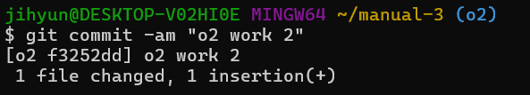 10. 수정한 work.txt 파일을 커밋하고 커밋 메시지는 'o2 work 2'라고 한다.