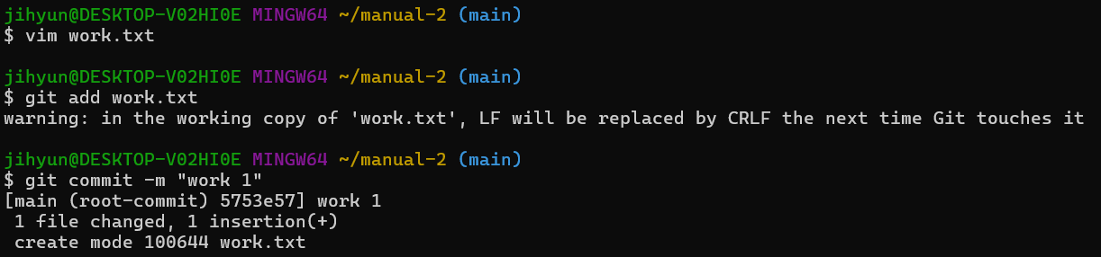 3. 방금 만든 work.txt를 스테이지에 올리고 커밋한다. 커밋 메시지는 'work 1'이라고 한다.