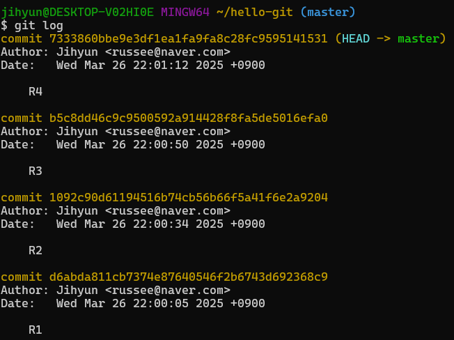 5. git log 명령을 사용하여 확인해보면 4개의 커밋이 있고 각 커밋마다 커밋 해시가 함께 나타나 있다.