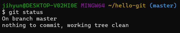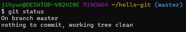 hello-git 디렉터리에서 깃을 초기화했기 때문에 버전 관리를 할 수 있다. 깃 상태를 먼저 확인해야 한다.