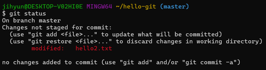 5. 다시 git status 명령을 실행한다. hello2.txt 파일이 수정되었고 아직 스테이지에 올라가지 않았다고 나타난다. 'Changes not stage for commit:' 이라는 메시지가 나타나면 파일이 수정만 된 modified 상태이다.