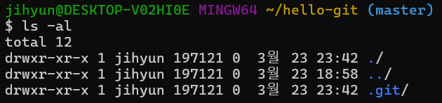 .git이라는 디렉터리가 생김. 이 디렉터리가 깃을 사용하면서 버전이 저장될 저장소이다.