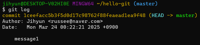 - 3번째 줄 commit 이라는 항목 옆에 영문과 숫자로 된 긴 문자열이 나타나는데 이를 커밋 해시(commit hash), 또는 깃 해시(git hash)라고 한다. 이는 커밋을 구별하는 아이디라고 생각하면 된다.