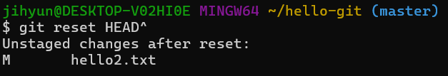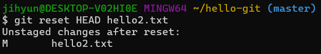 3. git reset 명령을 사용하여 스테이지에서 hello2.txt를 내린다.