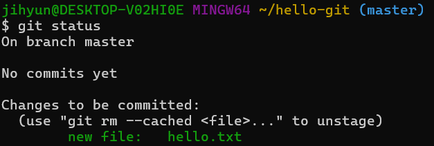그리고 hello.txt 파일 앞에 new file: 이라는 수식어가 추가로 나타난다.