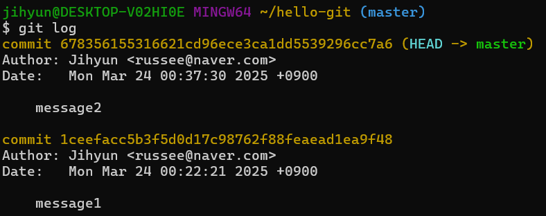 - 커밋 해시 옆에 있는 (HEAD -> master)는 이 버전이 가장 최신이라는 표시이다.