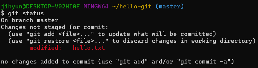 3. git status 명령을 사용하여 깃의 상태를 확인해보면 hello.txt 파일은 수정되었고, 아직 스테이징 상태가 아니라고 나온다.