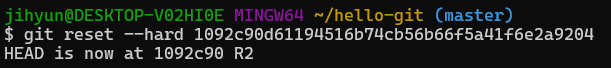 4개의 커밋 중 R2라는 메시지가 붙은 커밋으로 되돌려본다. 즉 R2 메시지가 있는 커밋을 최신 커밋으로 만들 것이다.