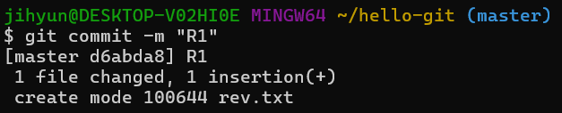 2. rev.txt를 스테이지에 올린 후 "R1" 메시지와 함께 커밋한다.