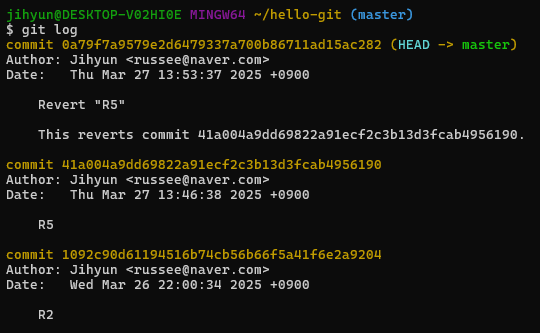 8. git log 명령을 사용해서 로그 목록을 살펴보면 R4와 R3 메시지가 있던 커밋은 삭제되고 커밋 해시를 복사했던 커밋이 최신 커밋이 되었다.