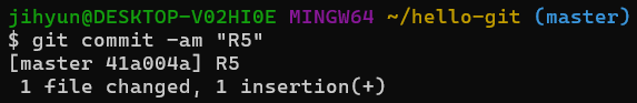 2. 커밋 후 결과 메시지를 보면 파일 1개가 변경되었고 파일 1개의 내용이 추가되었다고 나타다.